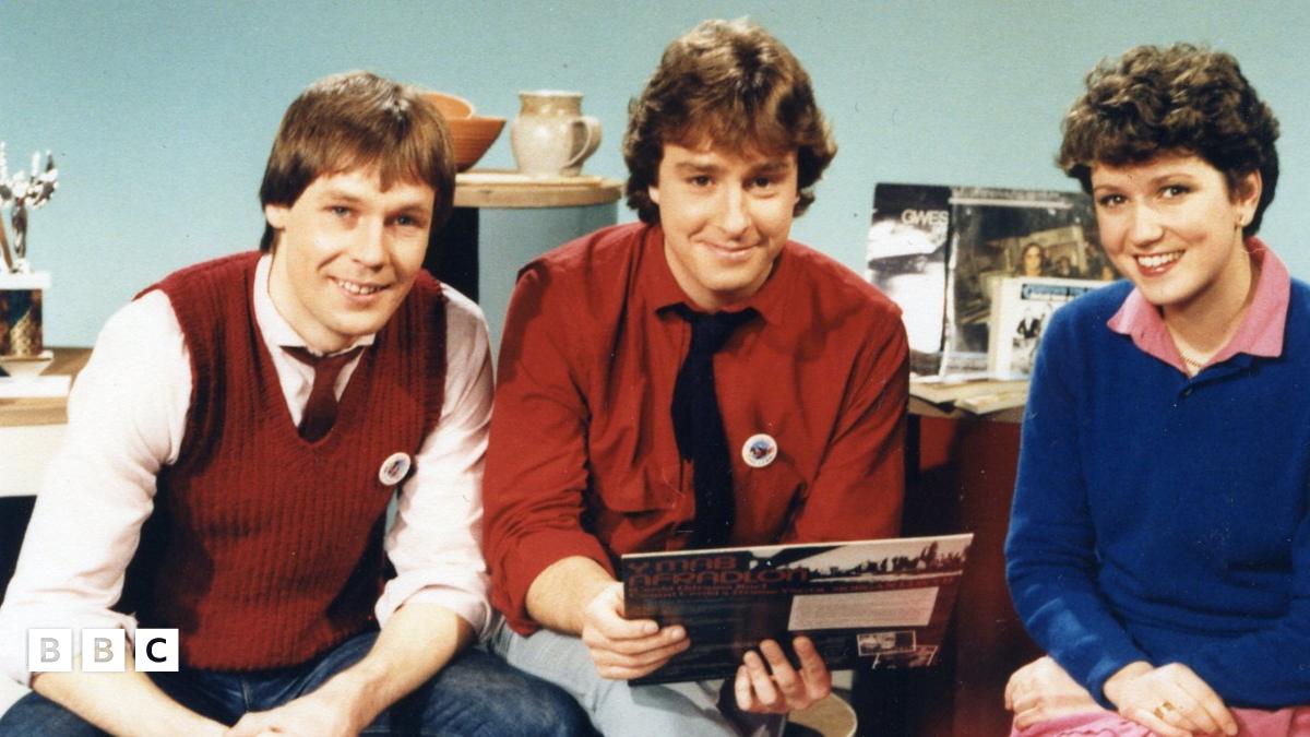 Emyr Davies, Dewi Williams ac Angharad Mair: Cyflwynwyr y rhaglen ar S4C yn 1982