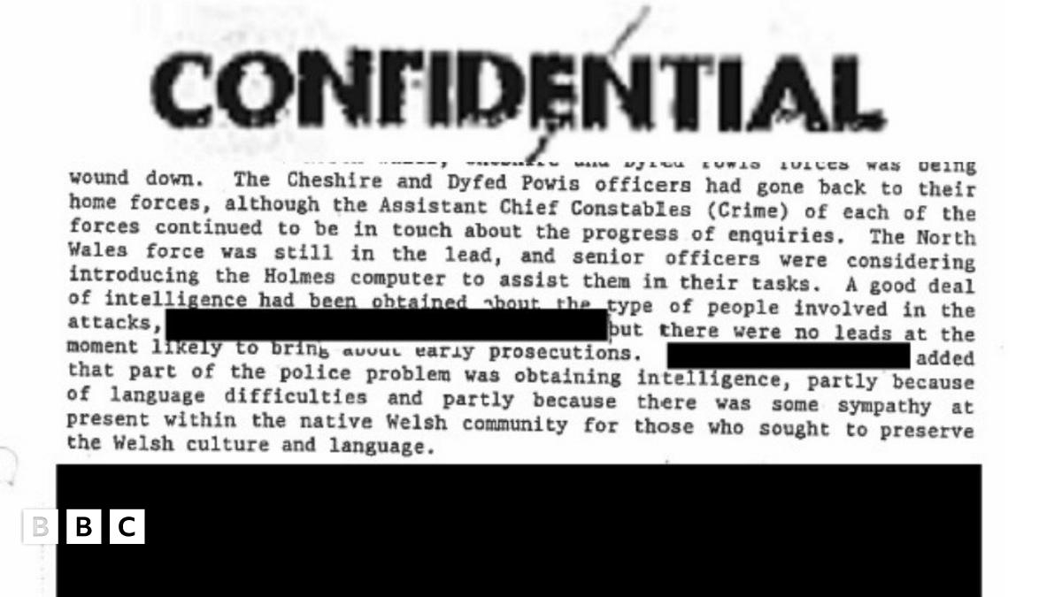 "A good deal of intelligence had been obtained about the type of people involved in the attacks-- but there were no leads at the moment likely to bring about early prosecutions. --added that part of the police problem was obtaining intelligence, partly because of language difficulties and partly because there was some sympathy at present within the native Welsh community for those who sought to preserve the Welsh culture and language."