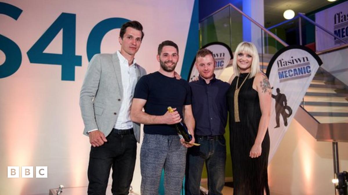 Emrys yn dathlu gyda arbenigwyr Ffasiwn Mecanic