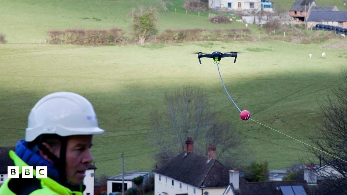 Drôn yn helpu gosod band-eang i gymuned Pontfadog