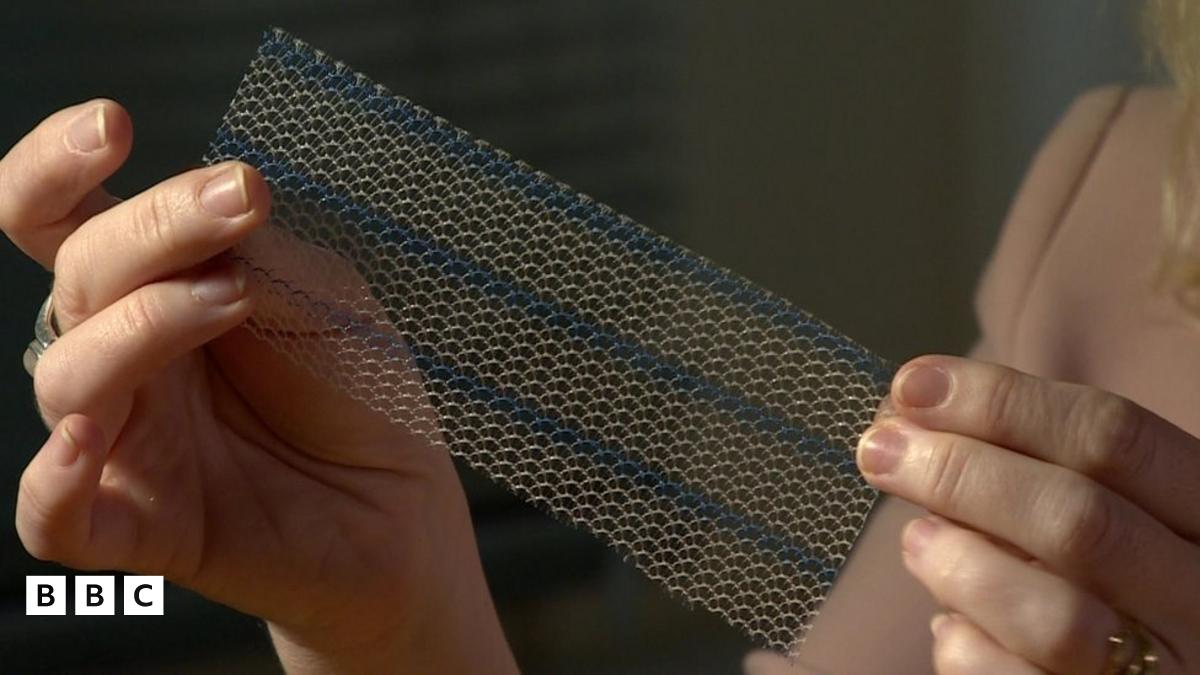 Reporter holding up a surgical mesh