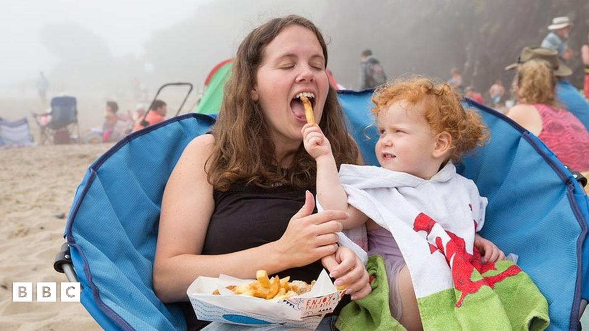 Un i fi... un i ti. Allwch chi byth fynd i ŵyl ar draeth Llangrannog heb fwynhau sglods!