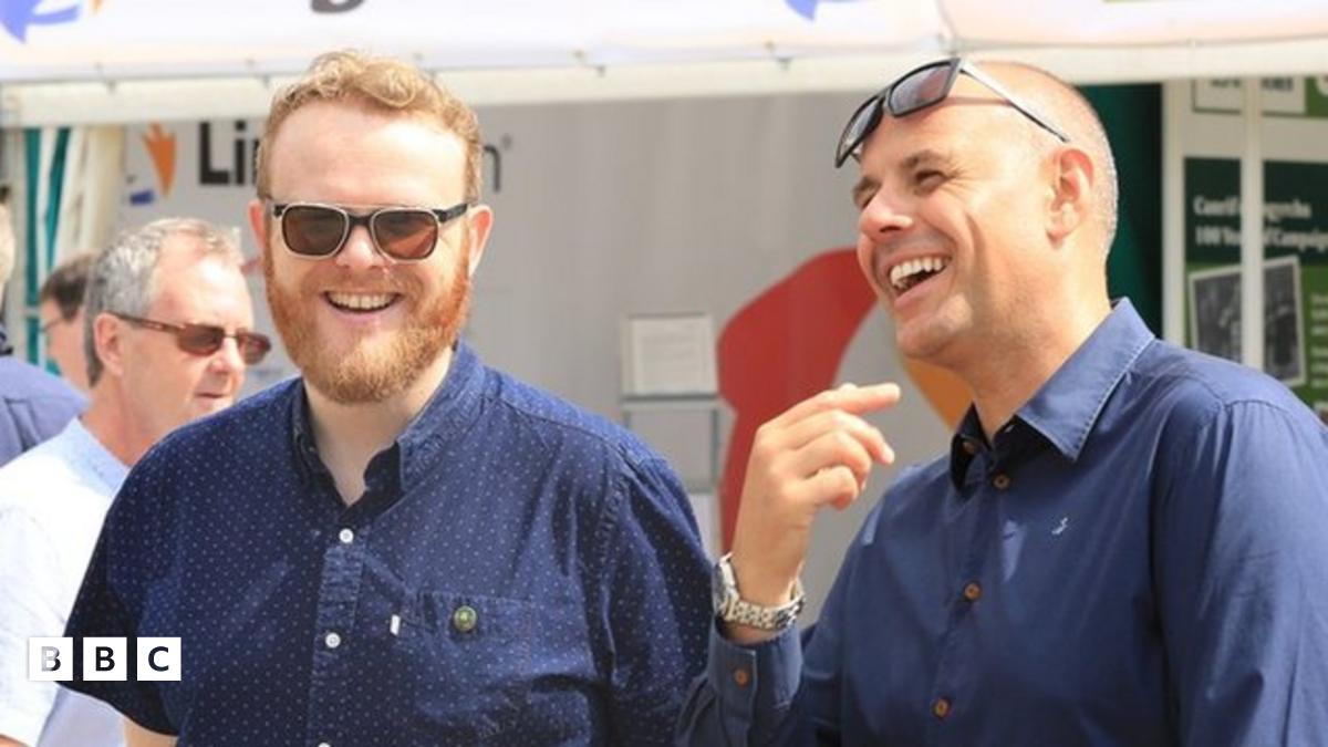 Mae fel 'Who's Who' yma... y cyflwynwyr Huw Stephens a Jason Mohammad yn rhannu jôc ar y Maes