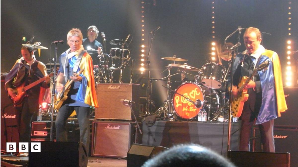 Paul Weller a'i fand oedd y cyntaf i wisgo'r clogynnau yng nghanolfan O2 Apollo Manceinion