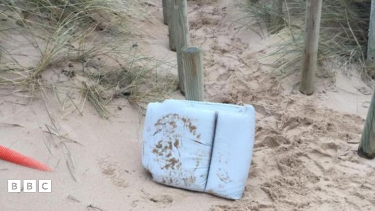 Traeth Surtainville, yn edrych tuag at Le Rozel, ble cafodd rhannau o sedd eu darganfod