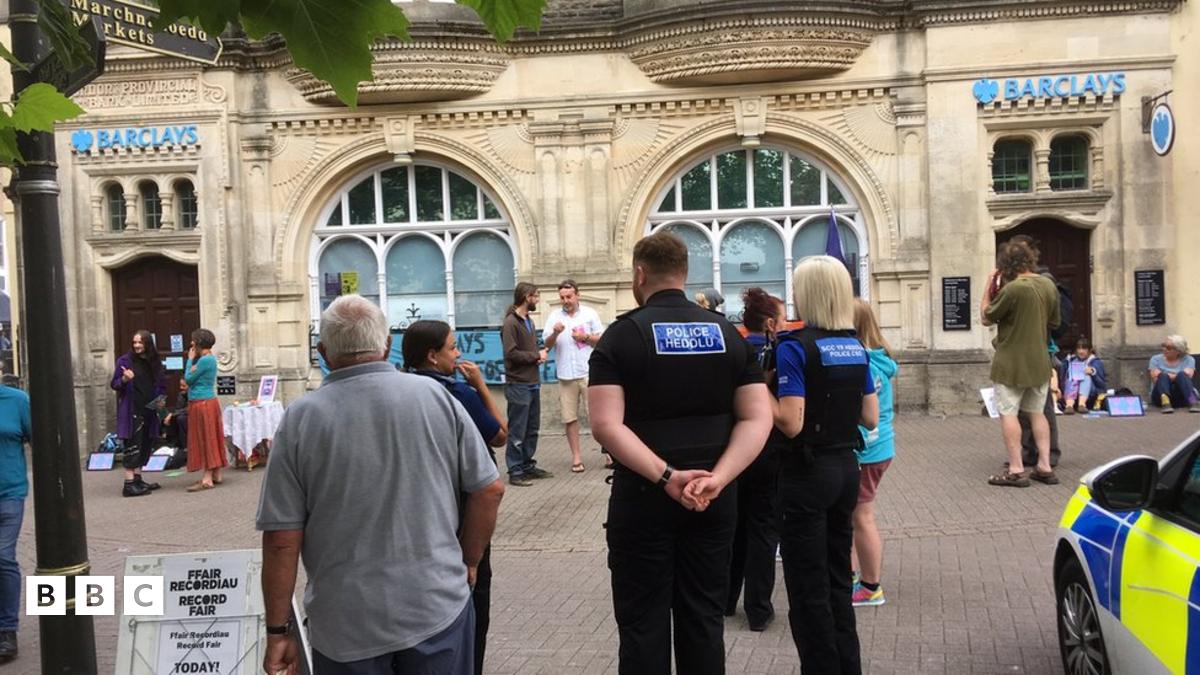 Yn ôl Heddlu Dyfed Powys fe gawson nhw eu galw am 09:35 dydd Sadwrn ar ôl derbyn adroddiad fod protestwyr y tu allan i Fanc Barclays ar Sgwâr y Guildhall yn y dref.