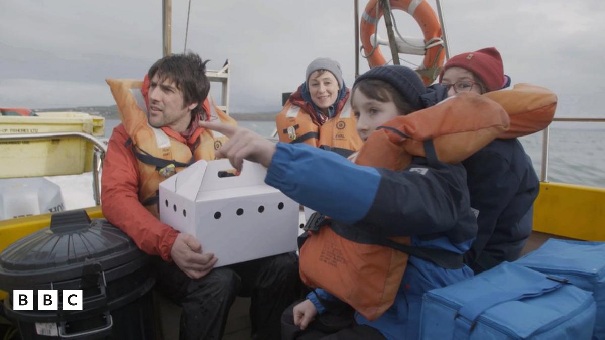 Y teulu ar eu ffordd i Ynys Enlli ym mis Chwefror