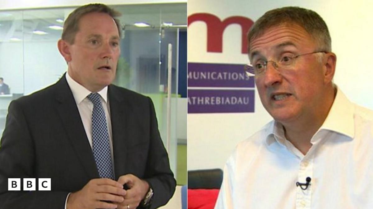 David Jones (chwith) ydy prif weithredwr Coleg Cambria, tra bod Rhodri Williams (dde) yn gyn-bennaeth Ofcom yng Nghymru