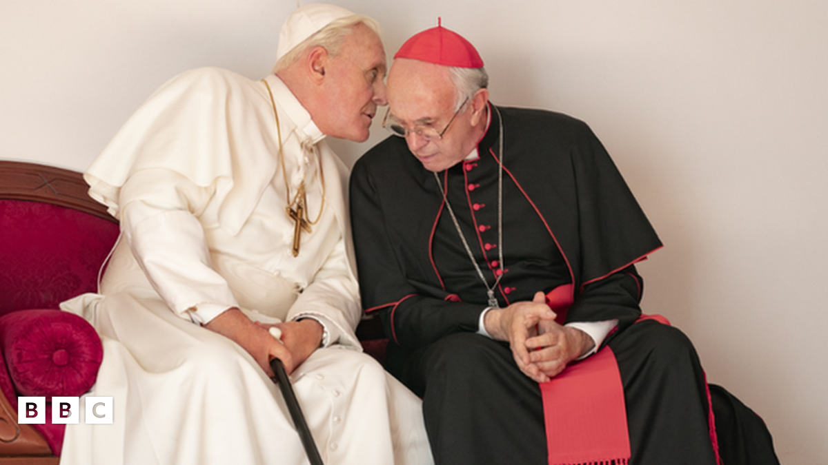 Syr Anthony Hopkins a Jonathan Pryce sy'n chwarae rhannau'r Pab Benedict a'r Cardinal Bergoglio, cyn cael ei ddewis i'w olynu fel y Pab Francis