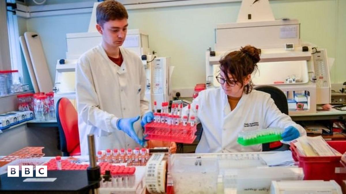 Technegwyr labordy Canolfan Arbenigol Firoleg yn cynnal prawf coronafeirws yn Ysbyty Athrofaol Cymru, Caerdydd