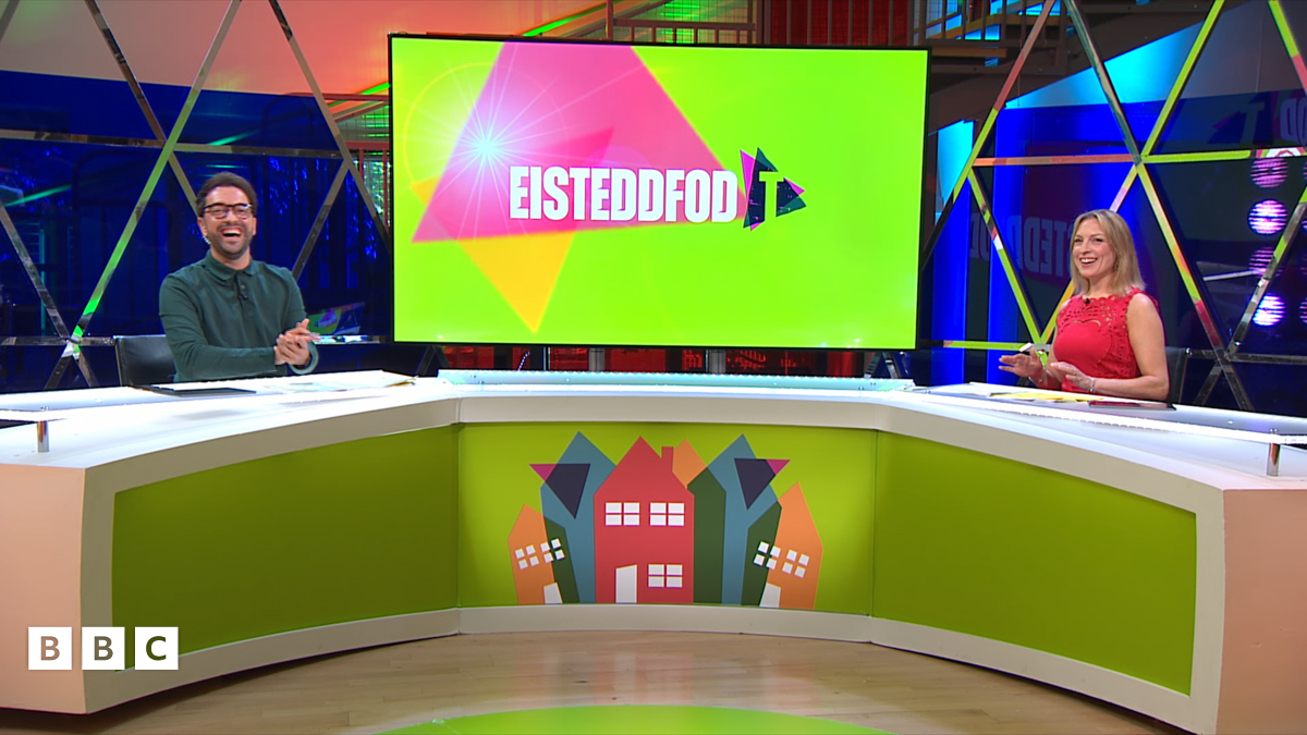 "Mae'r ochr dechnegol wedi bod yn dipyn o her - dibynnu'n llwyr ar westeion yn cael eu cyfweld o bell gan gyflwynwyr mewn stiwdio dros dro yng Ngwersyll yr Urdd Caerdydd, gan gadw at reolau pellter cymdeithasol, y beirniaid yn datgelu'r canlyniadau ar deledu byw, o'u cartrefi, ynghyd â'r holl gystadlu yn digwydd yn ddigidol.