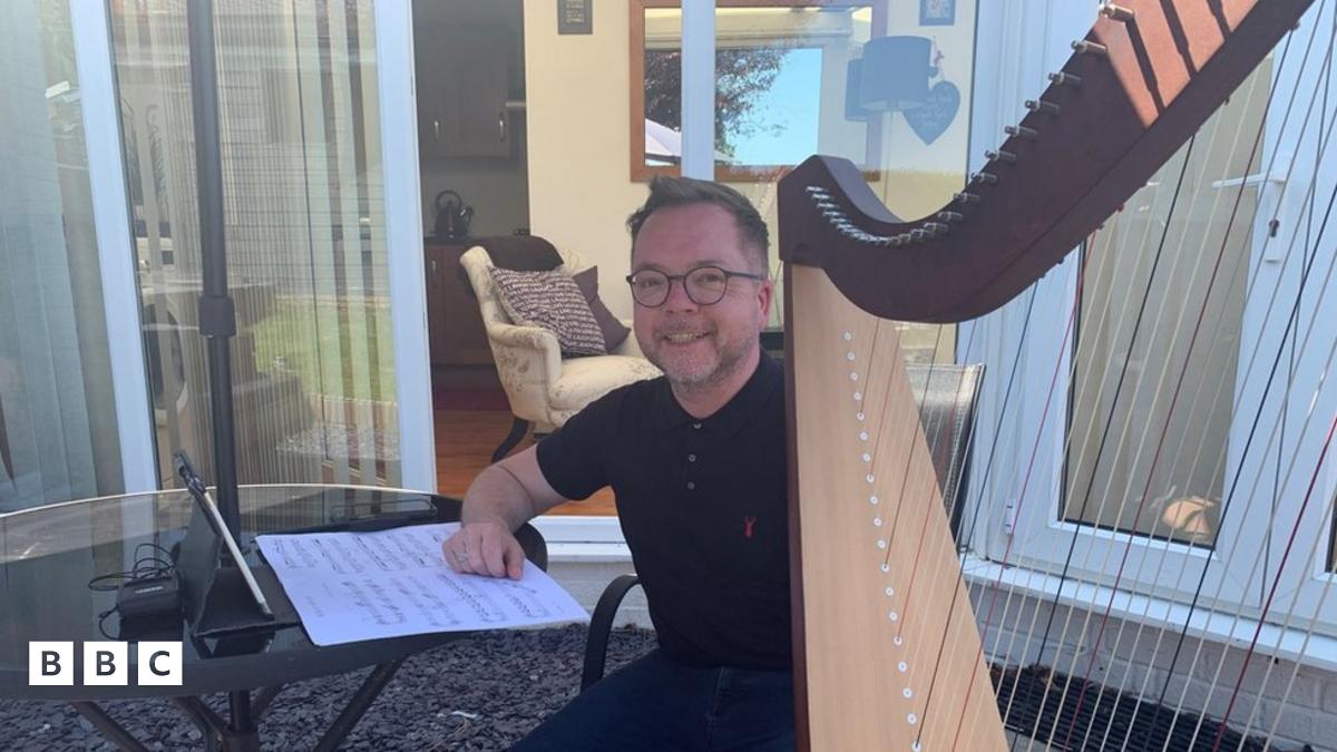 Mae'r telynor Dylan Cernyw'n rhoi gwersi o'i gartref gan fod hi'n amhosib teithio i'r ysgolion ar hyn o bryd