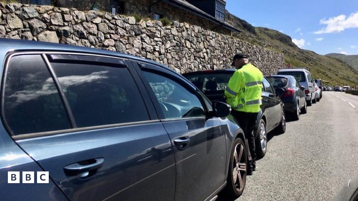 Cafodd cannoedd o yrwyr eu dirwyo am barcio ar ochr y ffordd ger Pen-y-Pass flwyddyn union yn ôl