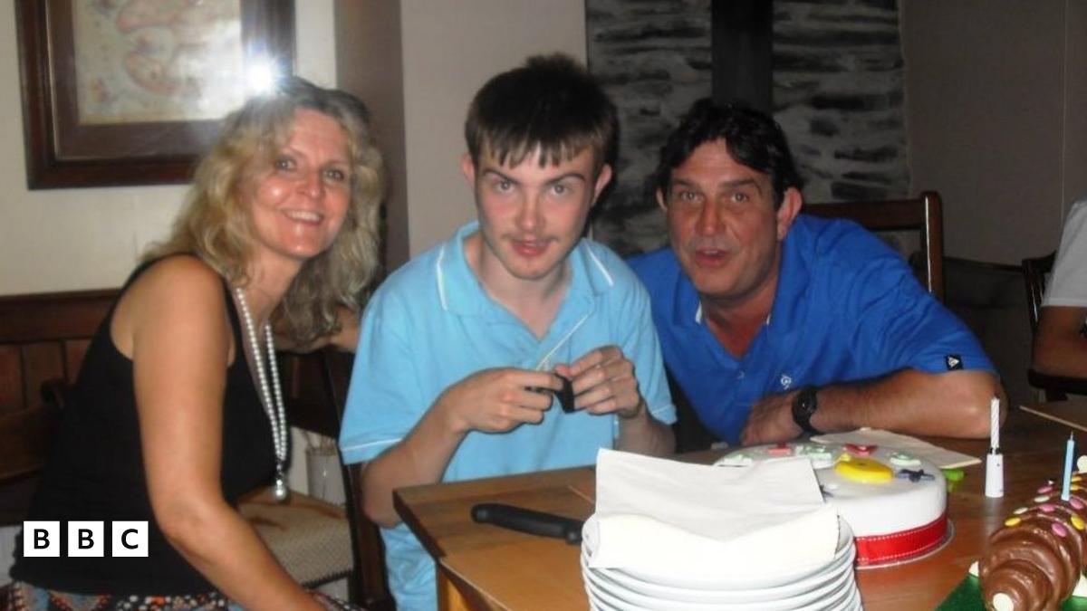 Pen-blwydd Joel (canol) yn 18 oed gyda'i fam Elin a'i dad Peris - mae Joel bellach yn 24