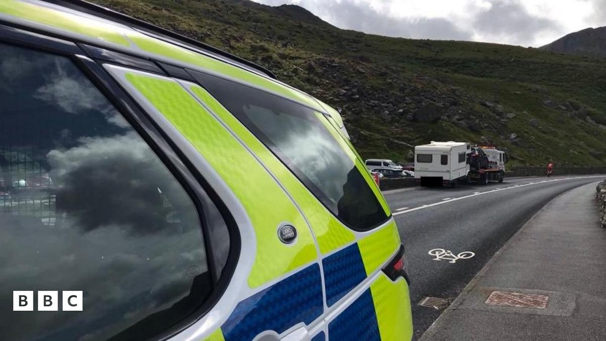 Carafan yn cael ei thynnu o'r A5 ger Llyn Ogwen