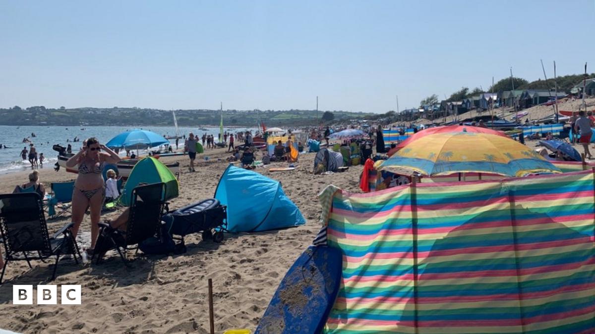 Ymwelwyr yn mwynhau'r haul yn Abersoch ddydd Sul