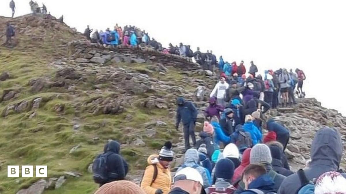 Cafodd lluniau o ddegau o bobl yn ceisio cyrraedd copa'r Wyddfa eu rhannu ar y cyfryngau cymdeithasol.