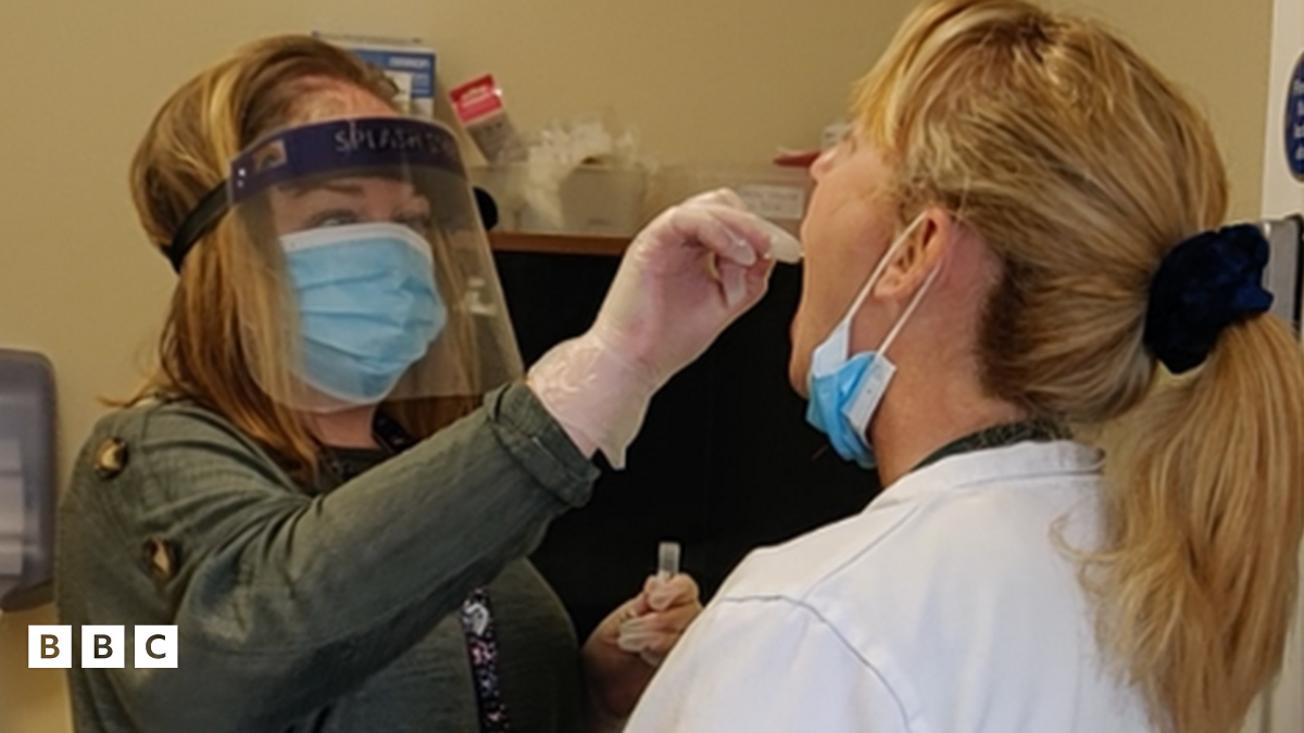 Aelod o staff cartref gofal yn rhoi prawf Covid i gydweithiwr