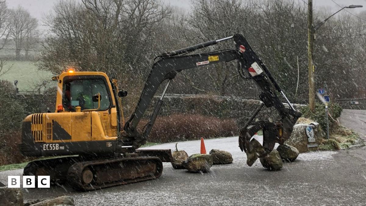 Y gwaith o gau maes parcio yn Llanuwchllyn fore Gwener