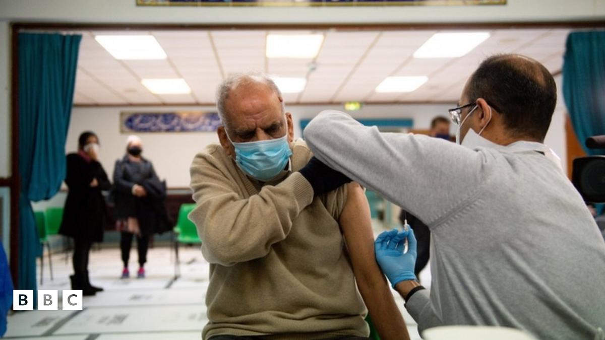 Masud Ahmad, 79, yn derbyn brechlyn mewn mosg yn Birmingham