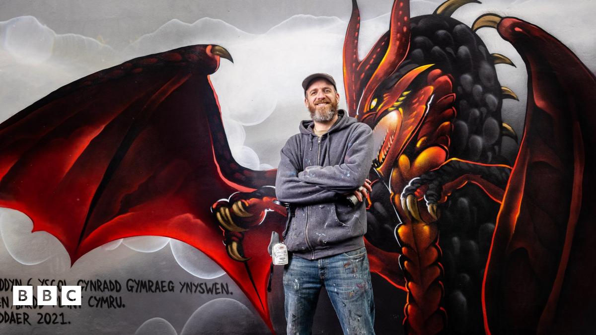 Graffiti draig gan Bryce, sydd i'w gweld yng Nghaerdydd