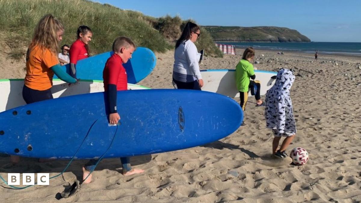 Yno mae dros 50 o blant a phobl ifanc yn dod ynghyd bob wythnos i ddysgu sut i syrffio'n ddiogel ar draeth Porth Neigwl.