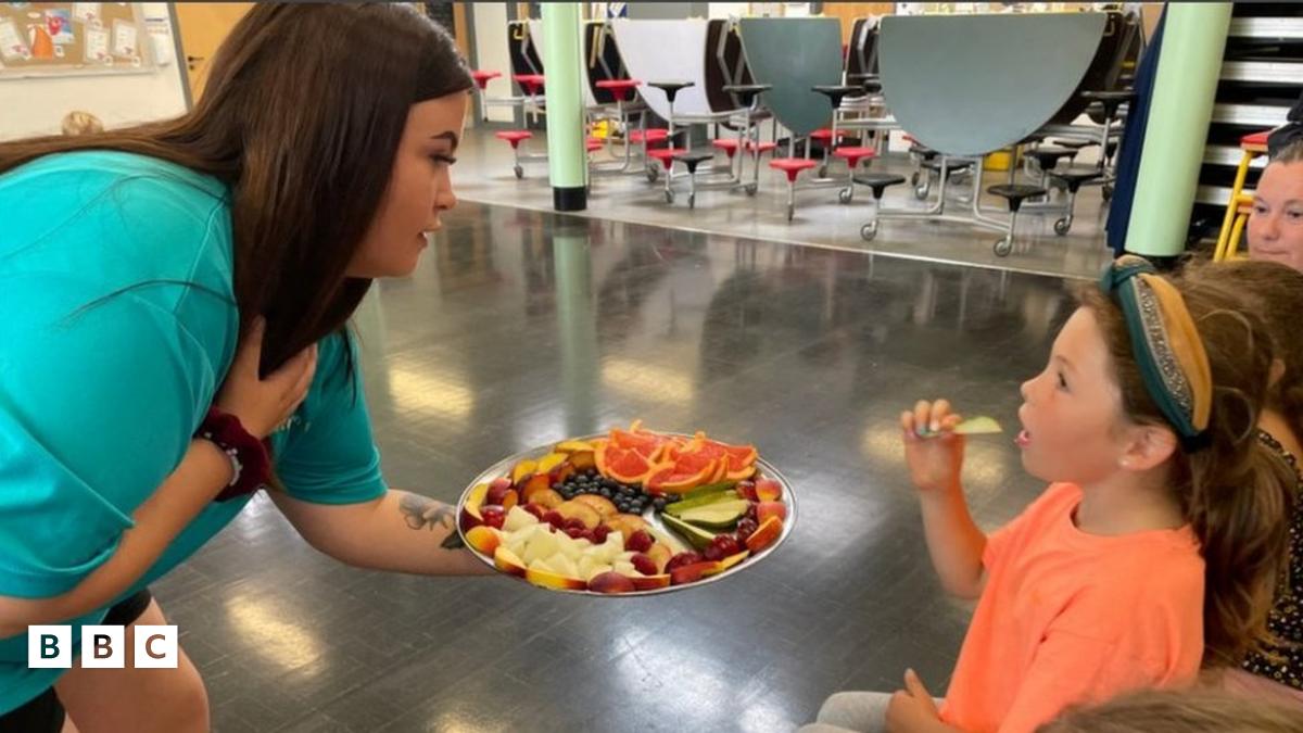Athrawes a disgybl yn ystod sesiwn bwyta'n iach yn Ysgol Gynradd Thornwell, Cas-gwent