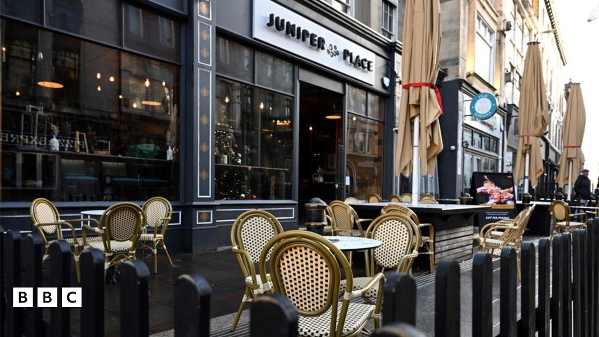 Byrddau gwag tu allan i far Juniper Place Caerdydd ddydd Gŵyl San Steffan, sef diwrnod cyntaf y cyfyngiadau diweddaraf