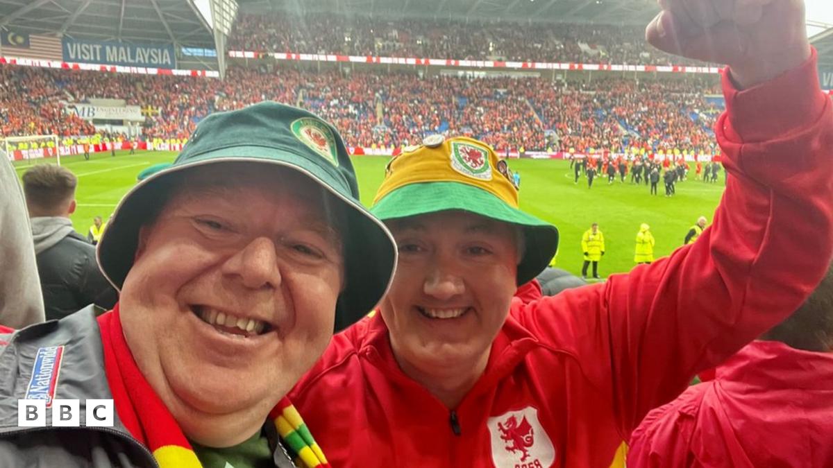 Phil Stead yn dathlu gyda'i ffrind Matthew yng Nghaerdydd wedi'r gêm aeth â Chymru i Gwpan y Byd. Mae wedi bod yn un o ddilynwyr selocaf Cymru ers 1980