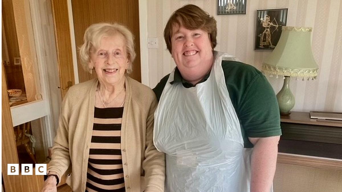 Llio Jones gydag Eunice Jones-Parry, un o'r unigolion y mae hi'n ymweld â nhw i ddarparu gofal yn y cartref
