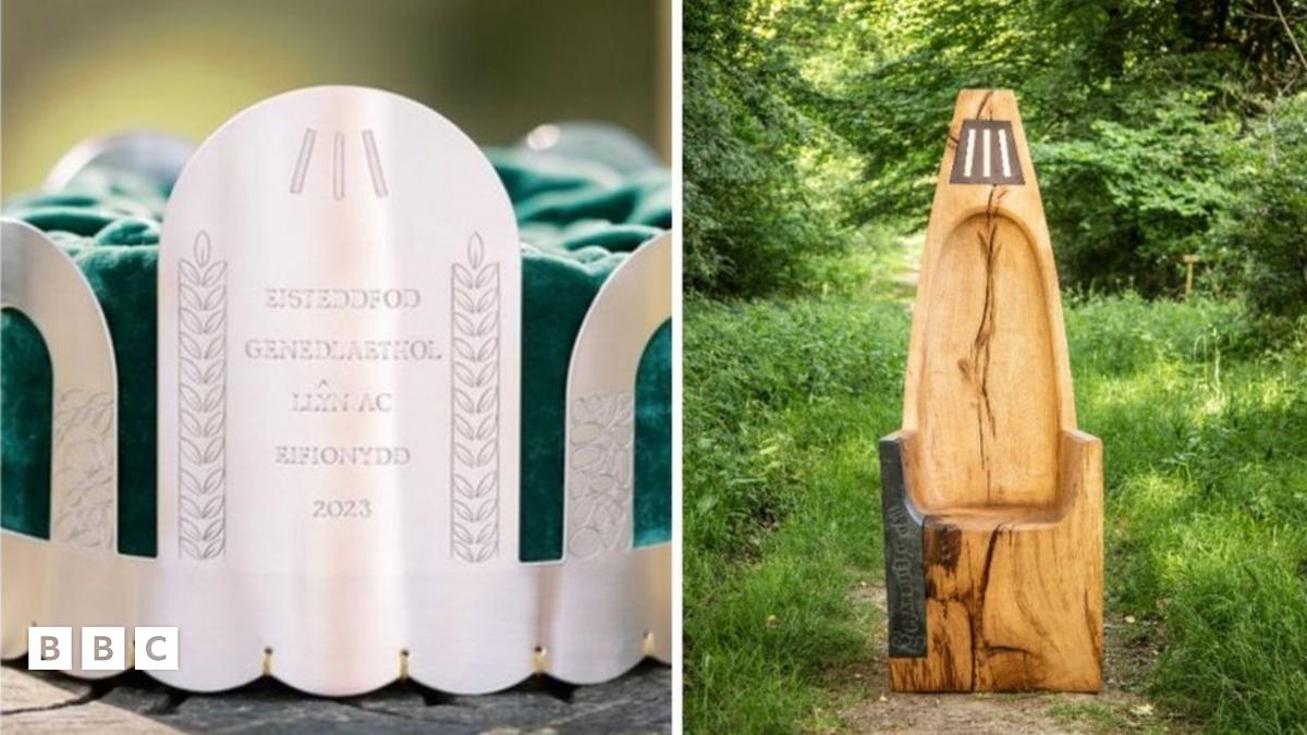 Elin Mair Roberts o'r Ffôr, ger Pwllheli, sydd wedi creu'r goron eleni, a Stephen Faherty - sy'n byw ger Rhuthun ond yn hanu o Bren-teg, ger Porthmadog - gafodd ei gomisiynu i greu'r gadair.