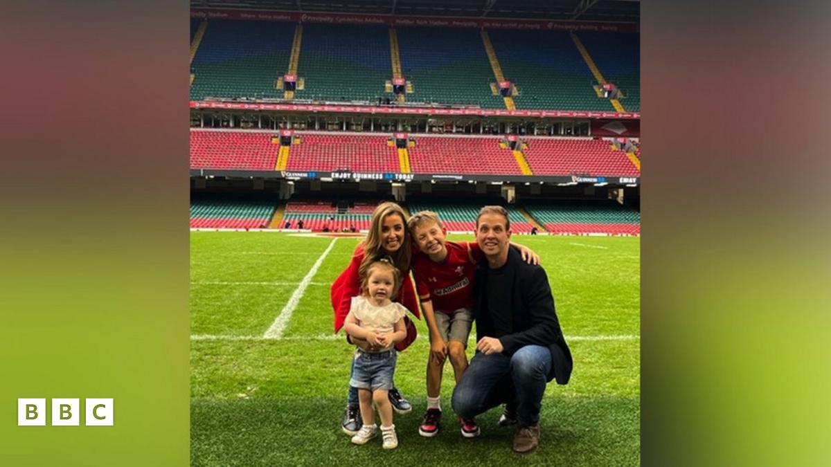 Dyma lun o fy nheulu bach i. Huw y gŵr, Guto sy'n ddeg a Gwenllian sy'n ddwy. Dyma ni yn Stadiwm y Principality ar ôl gwylio gêm Cymru yn erbyn De Affrica. Gêm gyntaf i Gwenllian oedd yn joio'r canu yn fwy na'r rygbi!