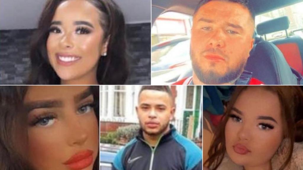 Roedd tri - Eve Smith, 21, Darcy Ross, 21, a Rafel Jeanne, 24 - wedi marw, ac mae Sophie Russon, 20, a Shane Loughlin, 32, yn parhau mewn cyflwr difrifol yn yr ysbyty.
