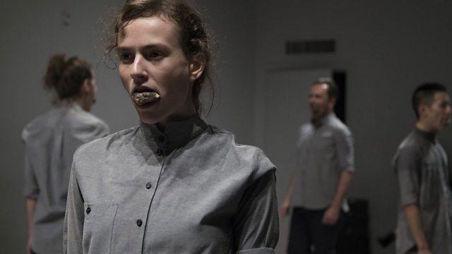 Sparse and monochromatic, The Burnt Room is performed by two dancers accompanied by its two creators, who are also responsible for the live soundtrack. Some of the familiar traits of Zuk and Fishof’s previous work are easily noticeable here: the measured theatricality; the use of movement to create a world of ethnographic fiction, with fabricated rituals, invented languages and an affinity to the absurd; and the complex interrelations between what is seen and what is heard. They often employ choreographic algorithms which can be manifested in dance and sounds imultaneously, and thus create a multidimensional choreographic tapestry of audial movement and visible sound.