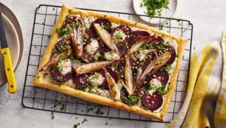 This simple vegan tart is topped with roasted beetroot and shallots and a quick cashew 'cream cheese'. Delicious served with salad.