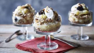 Make the best of autumnal produce with this scrumptious pudding that can be made well in advance. You will need a baking tray that snugly fits the pears and apples, and four large glasses or glass bowls.