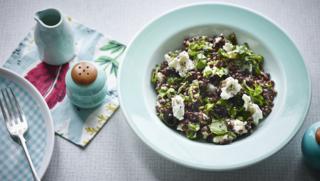 This combination of earthy lentils, tangy goats' cheese and fragrant basil is really satisfying. Serve it with salad leaves and crusty bread.