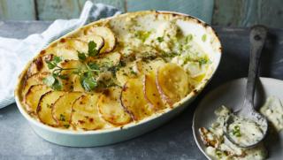 Level up your usual cauliflower cheese with a layer of crispy potatoes for a complete meal. You could try mixing up the cheese – use something like Gruyère or a creamy Stilton.