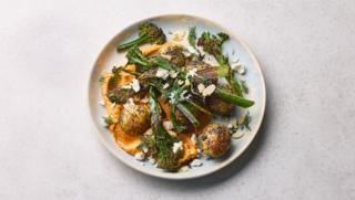 Great textures and flavours combine in this banging veggie main that showcases charred broccoli, herby roast potatoes and a red pepper-infused whipped tofu.