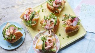 These simple prawn sandwiches are great as part of a spread for parties and picnics. The toppings make them super pretty and colourful, but they're still delicious if you want to keep it simple.