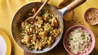 Ching He Huang’s wok-fried cauliflower is made with honey, soy sauce, hoisin and pine nuts. Use golden syrup or agave syrup instead of honey to make this vegan.