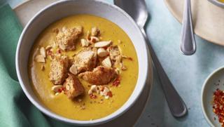 A wholesome, hearty carrot soup made with almond butter and topped with crunchy baked almonds and paprika-flecked croûtons.