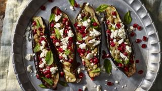 The pomegranate molasses is the secret to this delightful roast aubergine and feta vegetarian recipe. An effortless supper dish.