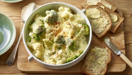 Drain the vegetables in a colander or large sieve then tip into a shallow ovenproof dish. Pour the sauce over. Sprinkle with the remaining cheese and place under a hot grill for 2–3 minutes, or until lightly browned. Don’t worry if you don’t have a grill, serve as soon as you’ve sprinkled with the cheese. Serve with freshly buttered bread if you like.