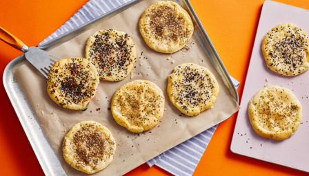 Scatter two cloud breads with sesame seeds, two with za’atar, two with a combination of nigella seeds and chilli and the final two with a combination of garlic granules and dried oregano. Bake for 15 minutes until puffy and golden brown.