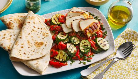 Make sure the griddle pan is still hot. Oil the block of halloumi, then place on the griddle pan and cook on each side until charred – this will take about 6–8 minutes. Remove the halloumi and warm the flatbreads on the griddle pan for a minute. Slice the halloumi and serve with the courgettes and peppers, the cucumber and yoghurt and the flatbreads.