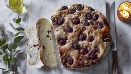 Grapes soaked in red wine top this unusual focaccia studded with dried cranberries.