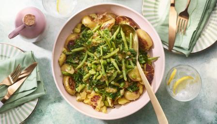 Feel free to swap in whatever seasonal greens you can get hold of for this fabulous crispy potato salad. It's a great recipe for a summer party and you can top it with edible flowers or a scattering of fresh herbs, if you wish.