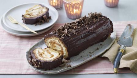 Put the roll on a serving plate, spread the ganache on top and sprinkle over the chopped chocolate. Serve in slices.