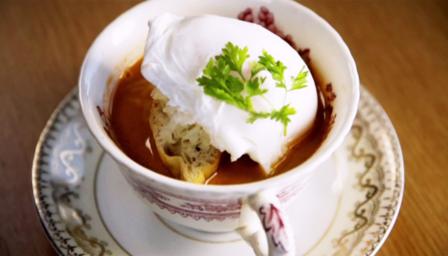 Top each crostini with a teaspoonful of rouille and a little grated gruyère. Top each with a poached bantam egg and garnish with a sprig of parsley or chervil.